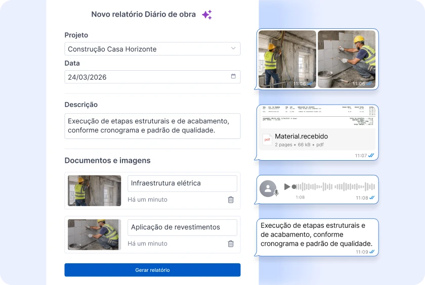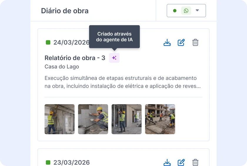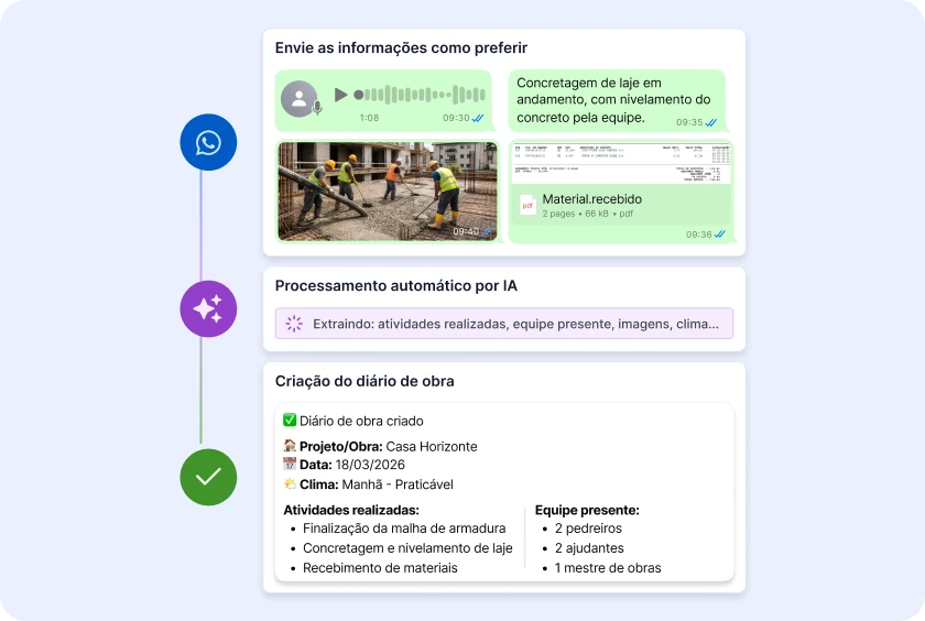 "Uma plataforma completa e prática. Configuro templates e diários de obra, controlo meu financeiro, monto orçamentos e ainda compartilho tudo isso com meus clientes. Sensacional."